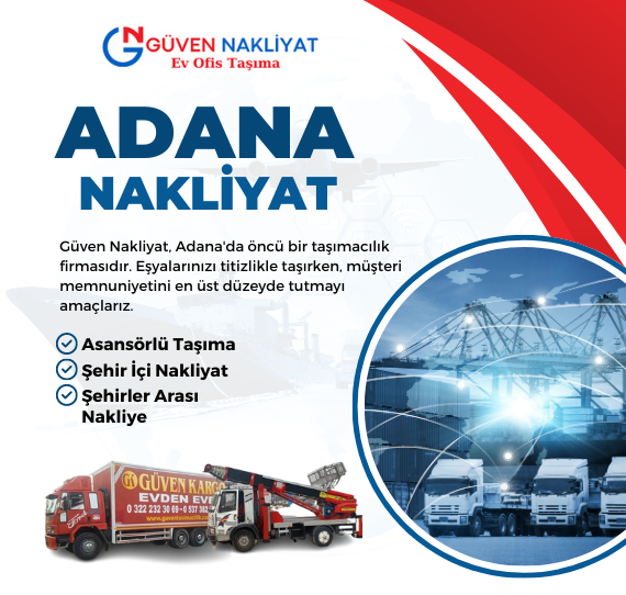 Güven Nakliyat, Adana ve çevresinde evden eve nakliyat hizmeti sunmaktadır. İhtiyaçlarınıza göre geniş bir bölgede hizmet veriyoruz.Çukurova,Seyhan,Yüreğir ve Sarıçamdan bize ulaşın